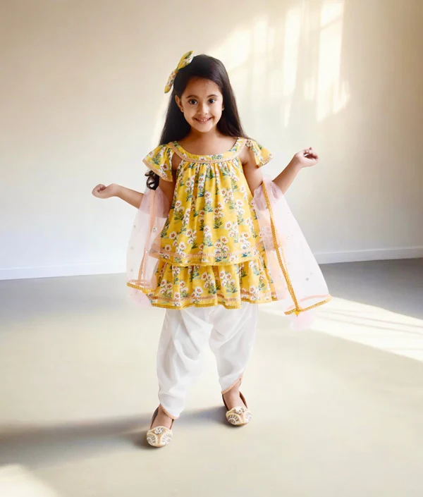 Elevate your daughter’s festive wardrobe with our Yellow Printed Kurti with Dhoti set. This stylish outfit features a printed layered kurti with a comfortable cotton lining, finished with delicate laces. The round neck kurti is paired with an off-white dhoti, also adorned with lace detailing. The set is completed with a sequined boti dupatta, beautifully finished with laces and tassels. Lightweight and perfect for the summer, this premium ensemble is ideal for any festive occasion.